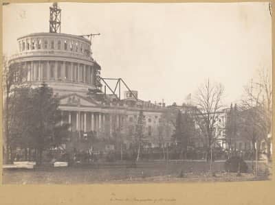The following photograph shows the Capitol, Washington, D.C., under construction during Abraham Lincoln’s inauguration, 165 years ago this Wednesday, 4 March 1861.