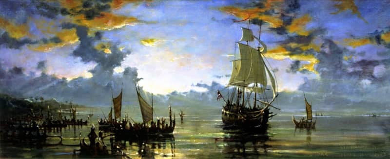 The HMS Bounty arrives at Matavai Bay on the north coast of Tahiti, 1789. Painting by John Hagan.