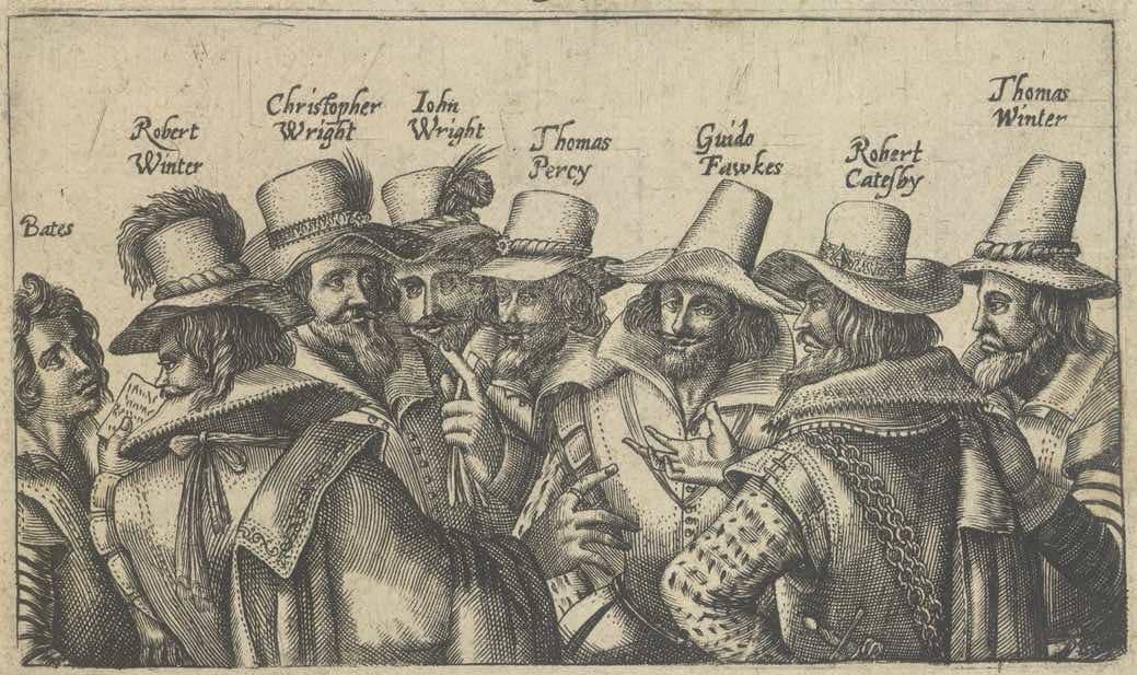Eight of the Gunpowder Plot conspirators. From left to right: Thomas Bates; Robert Winter; Christopher Wright; John Wright; Thomas Percy; Guy (Guido) Fawkes; Robert Catesby and Thomas Winter.