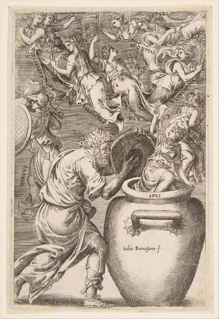 In this engraving, the artist Giulio Bonasone (1531-76) subtly balances out the misogynistic myth of Pandora’s Box by showing Epimetheus, Pandora’s husband, opening the 'jar'.