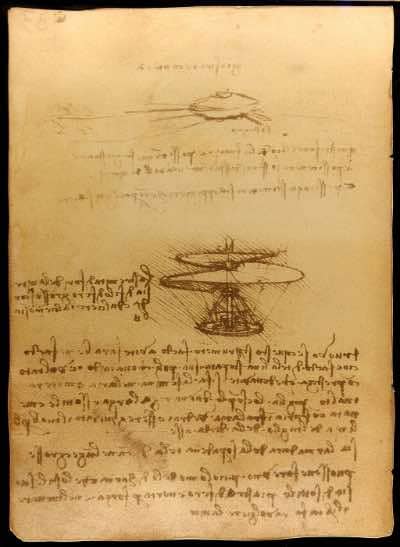 Leonardo’s earliest schemes for human flight took the form of large articulated flapping-wing machines (referred to as Ornithopters) and the aerial screw, a giant corkscrew designed to drill its way upward through the air.